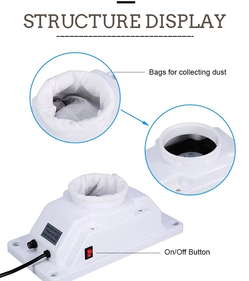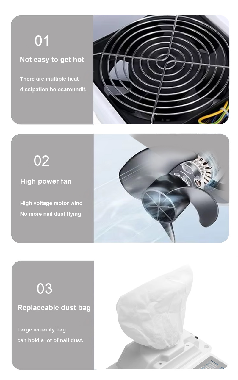 Il forte assorbimento dei detriti delle unghie dei prodotti non lascia fuoriuscire la polvere, mantiene il piano di lavoro pulito e ordinato, l'aspirazione rapida non perde la polvere ad alta potenza più efficiente.