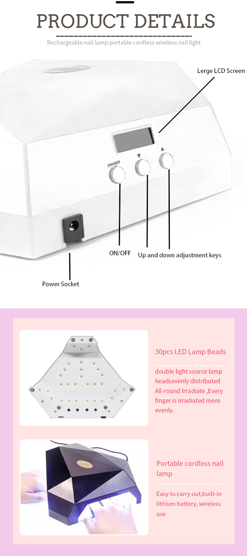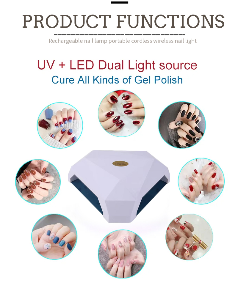Il prodotto garantisce un'asciugatura uniforme della colla senza ritiro. Le sue doppie sorgenti luminose forniscono un riscaldamento delicato per prevenire lo scolorimento delle mani e l'affaticamento degli occhi, adatte sia alle mani che ai piedi, offrendo risultati di asciugatura straordinariamente rapidi.