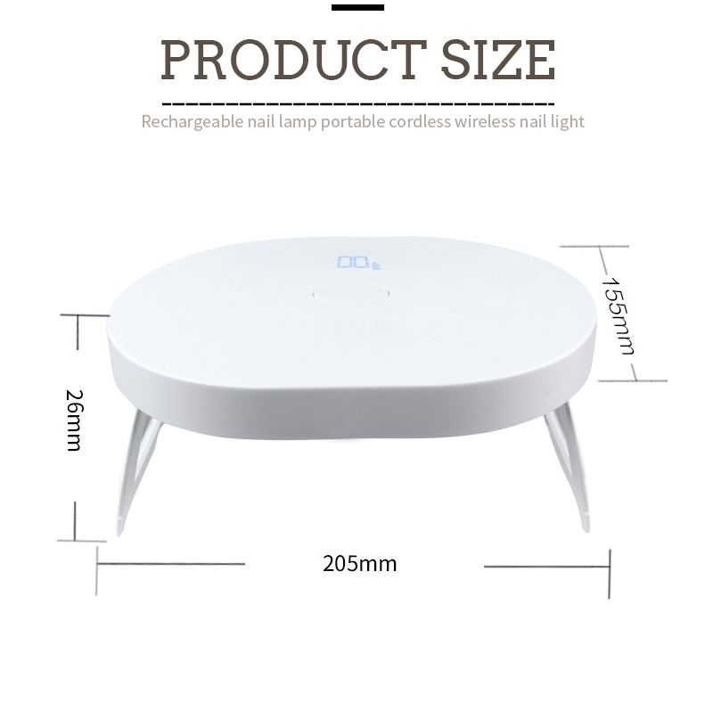 Le dimensioni della mini lampada pieghevole per asciugare le unghie sono 205 mm di lunghezza, 155 mm di larghezza e 26 mm di altezza, con una grande capacità e la possibilità di utilizzare sia le mani che i piedi, il che è molto conveniente.