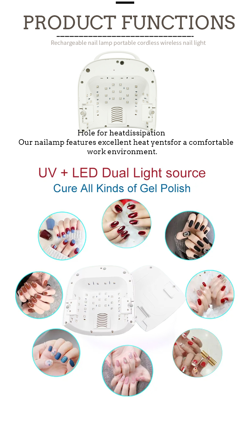 Il prodotto garantisce un'asciugatura uniforme della colla senza ritiro. Le sue doppie sorgenti luminose forniscono un riscaldamento delicato per prevenire lo scolorimento delle mani e l'affaticamento degli occhi, adatte sia alle mani che ai piedi, offrendo risultati di asciugatura straordinariamente rapidi.