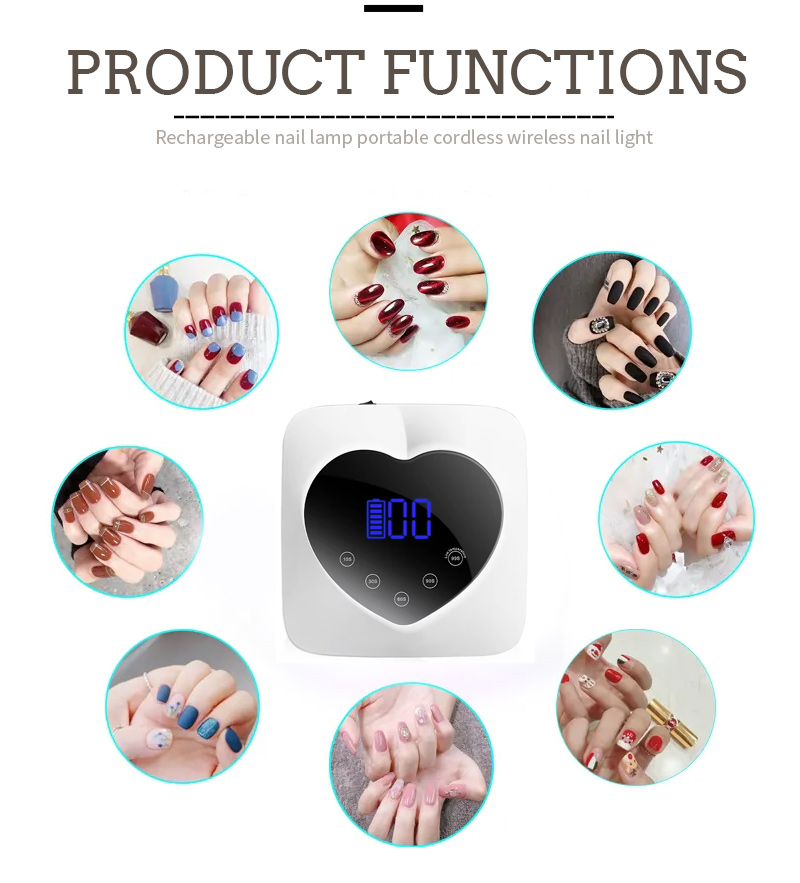 Il prodotto garantisce un'asciugatura uniforme della colla senza ritiro. Le sue doppie sorgenti luminose forniscono un riscaldamento delicato per prevenire lo scolorimento delle mani e l'affaticamento degli occhi, adatto sia alle mani che ai piedi, offrendo risultati di asciugatura straordinariamente rapidi.