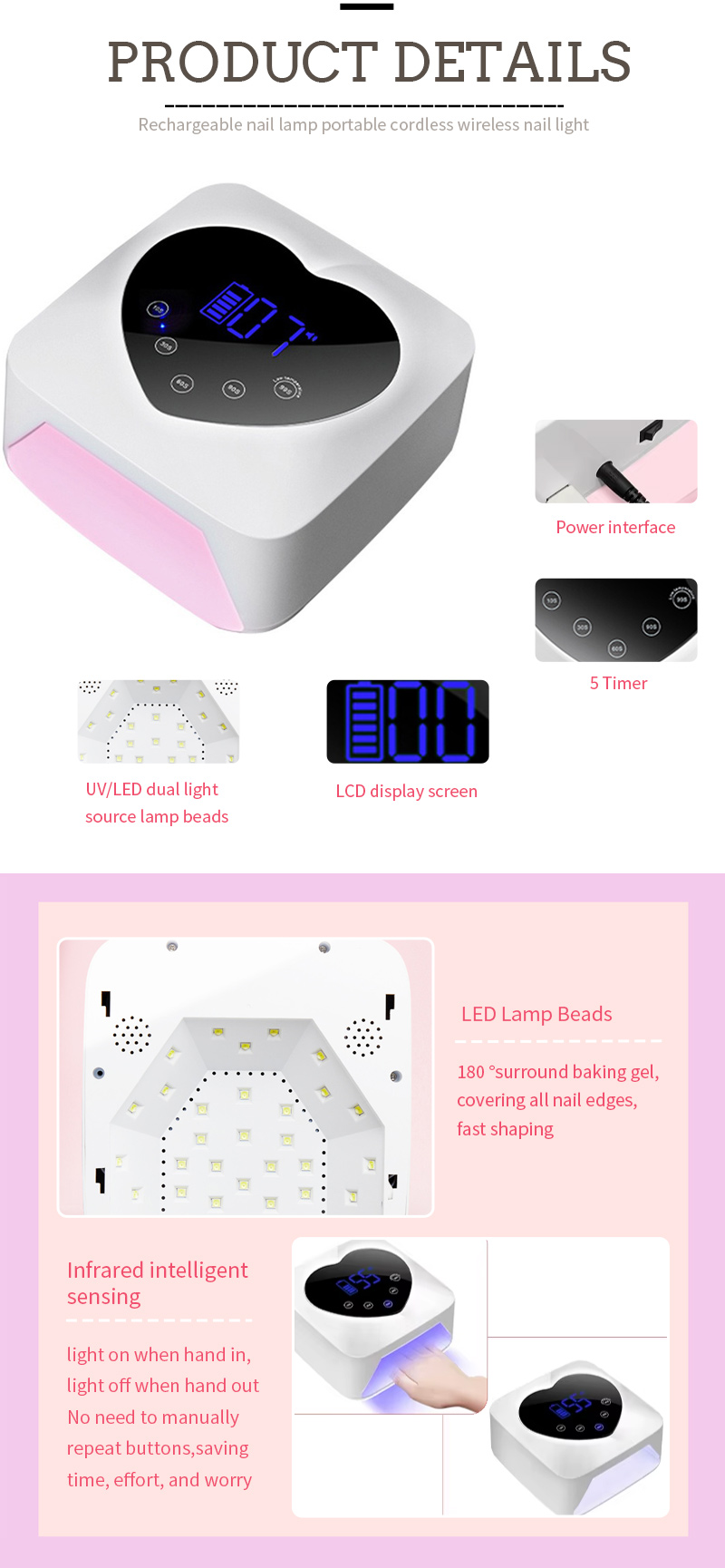 Dotata di tecnologia di rilevamento intelligente a infrarossi, la luce si attiva quando le mani si avvicinano e si disattiva quando le mani si allontanano, eliminando la necessità di ripetute pressioni manuali dei pulsanti, risparmiando tempo e fatica. L'asciugatura della colla ad alta potenza non richiede lunghi periodi di attesa, risparmiando tempo e fatica.