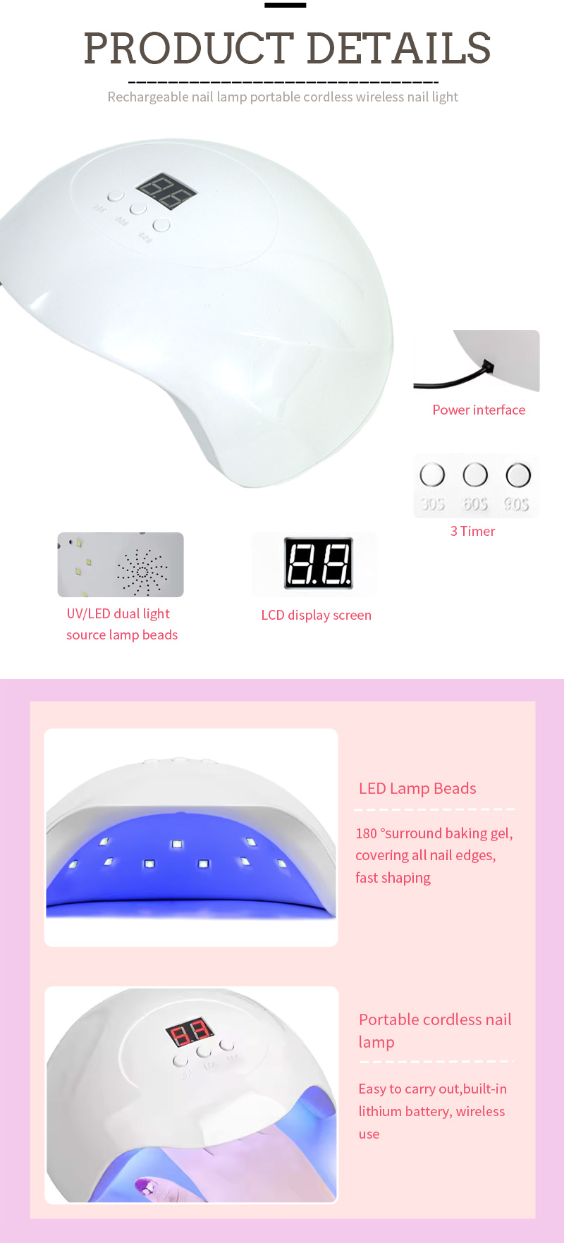 Il prodotto garantisce un'asciugatura uniforme della colla senza ritiro. Le sue doppie sorgenti luminose forniscono un riscaldamento delicato per prevenire lo scolorimento delle mani e l'affaticamento degli occhi, adatto sia alle mani che ai piedi, offrendo risultati di asciugatura straordinariamente rapidi.