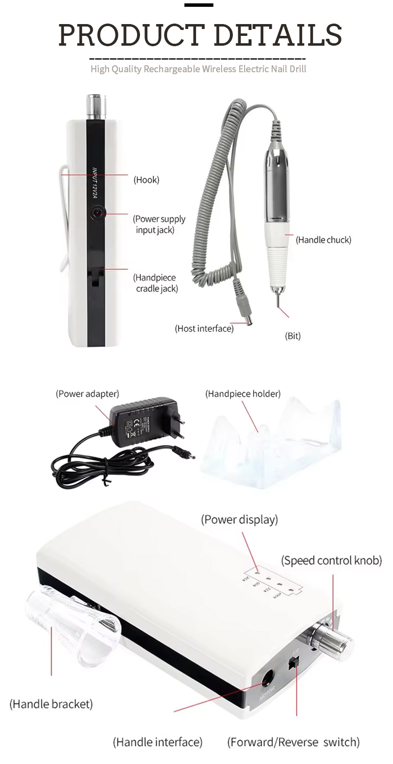 Set trapano per unghie ricaricabile con potente manipolo 45w 35000 giri/min