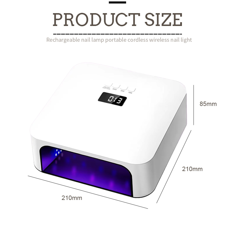 Le dimensioni di questa lampada per l'asciugatura rapida delle unghie di alta qualità sono 210 mm di lunghezza, 210 mm di larghezza e 85 mm di altezza, con una grande capacità e la possibilità di utilizzare sia le mani che i piedi, il che è molto conveniente.