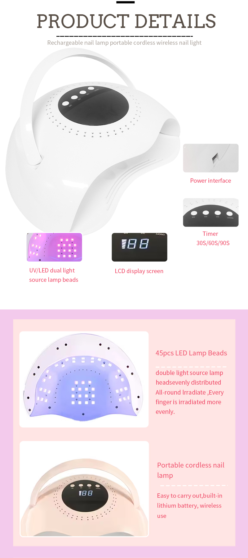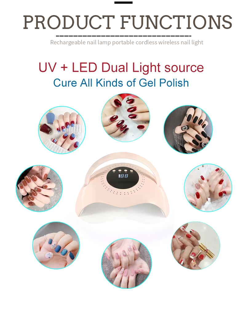 Il prodotto garantisce un'asciugatura uniforme della colla senza ritiro. Le sue doppie sorgenti luminose forniscono un riscaldamento delicato per prevenire lo scolorimento delle mani e l'affaticamento degli occhi, adatte sia alle mani che ai piedi, offrendo risultati di asciugatura straordinariamente rapidi.