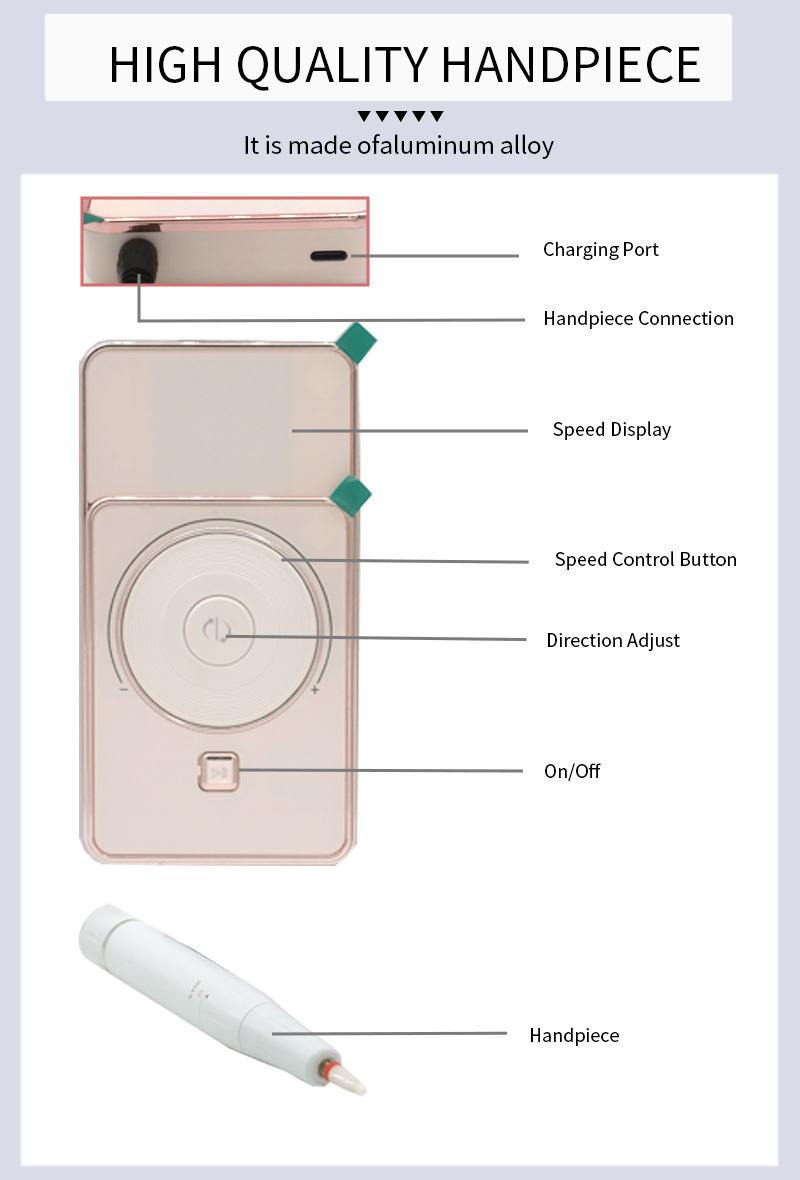 Questo design del display con penna abrasiva ad alta velocità e basso rumore, con presa per penna abrasiva, display LCD a cristalli liquidi può mostrare il numero di giri/potenza/direzione, manopola dell'interruttore di velocità, pulsante di attivazione in senso orario/antiorario, pulsante di pausa, motore professionale da 30.000 giri/min, testa di smerigliatura con bloccaggio a vite.