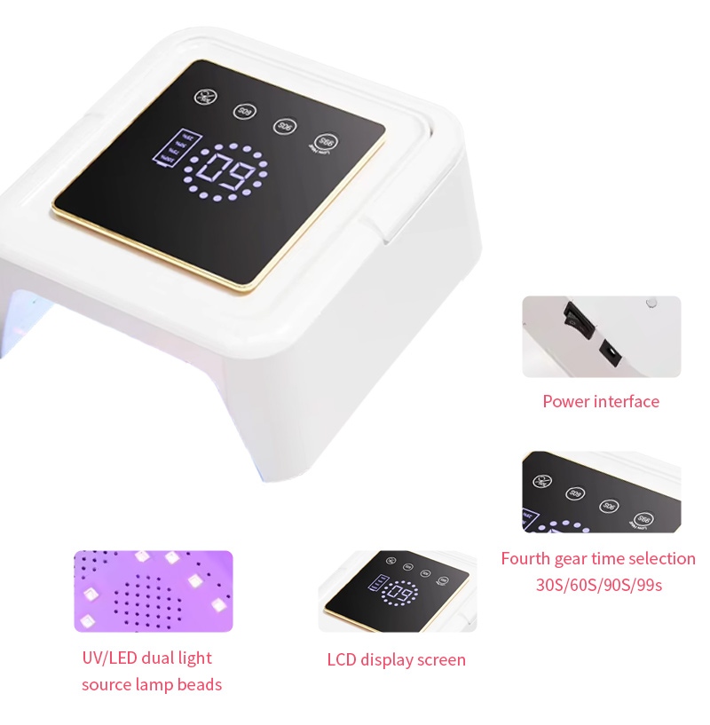 La lampada quadrata per l'asciugatura delle unghie garantisce un'asciugatura uniforme della colla senza restringimenti. Le sue doppie sorgenti luminose forniscono un riscaldamento delicato per prevenire lo scolorimento delle mani e l'affaticamento degli occhi, adatte sia alle mani che ai piedi, offrendo risultati di asciugatura straordinariamente rapidi.