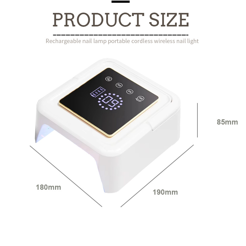 Le dimensioni della lampada quadrata per asciugare le unghie sono 180 mm di lunghezza, 190 mm di larghezza e 85 mm di altezza, con una grande capacità e la possibilità di utilizzare sia le mani che i piedi, il che è molto comodo.