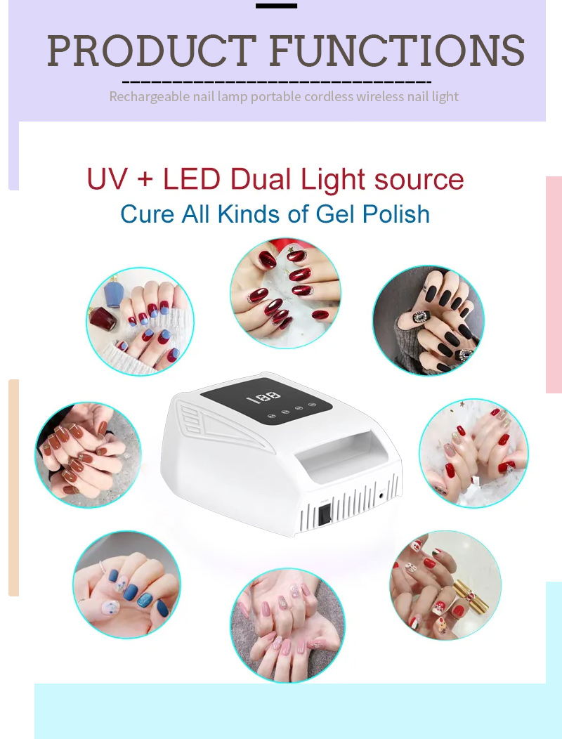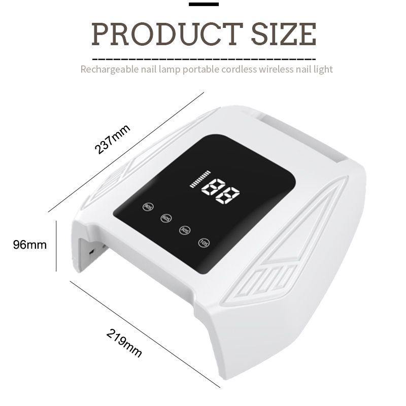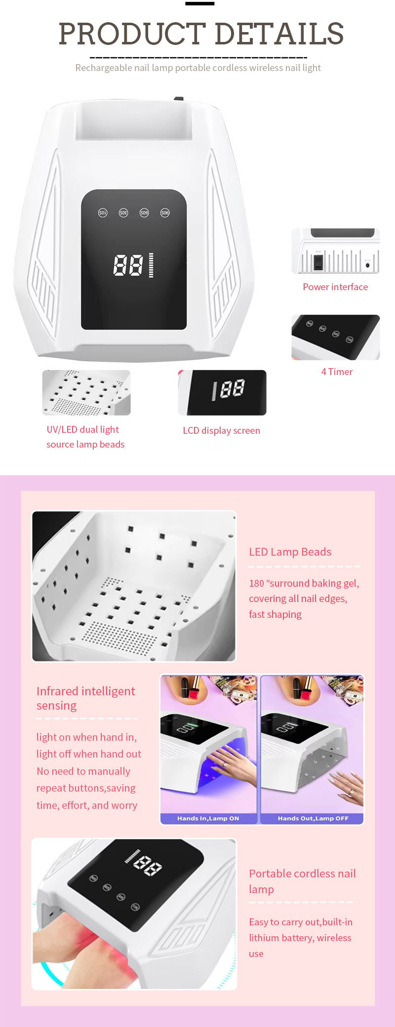 Lampada di smalti per unghie ricaricabile La versione professionale della versione 120W ha un design della scanalatura, la maniglia nella scanalatura può essere utilizzata come ruolo di maniglia portatile, rendendo più conveniente da trasportare e mettere. Evita anche lo svantaggio che la maniglia sia facilmente spezzata e liberata.